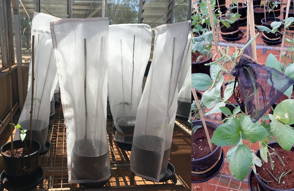 Whole plants were caged (secured at bottom during testing) for the vegetative and early reproductive stages. For late podding, Rutherglen bugs were caged on individual pods.