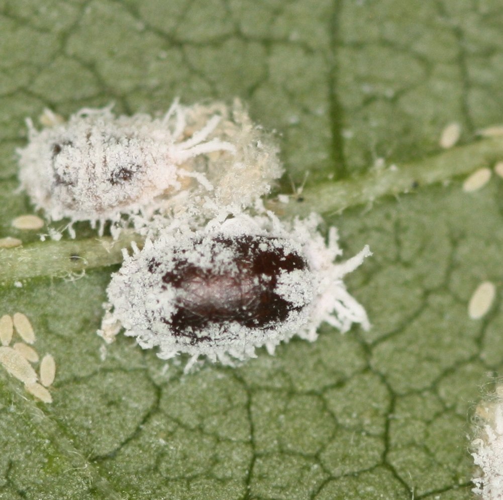 There are currently no effective insecticides registered so the only mechanism available for managing this pest is to rely on the biological control provided by natural enemies such as lacewings, ladybird beetles (cryptolaemus and three banded in particular) and mealybug parsitoids. Evidence that natural enemies are present include the eggs and larvae of green lacewings, ladybird eggs, larvae and adults, and the brown pupal cases of parasites in amongst mealybug colonies.