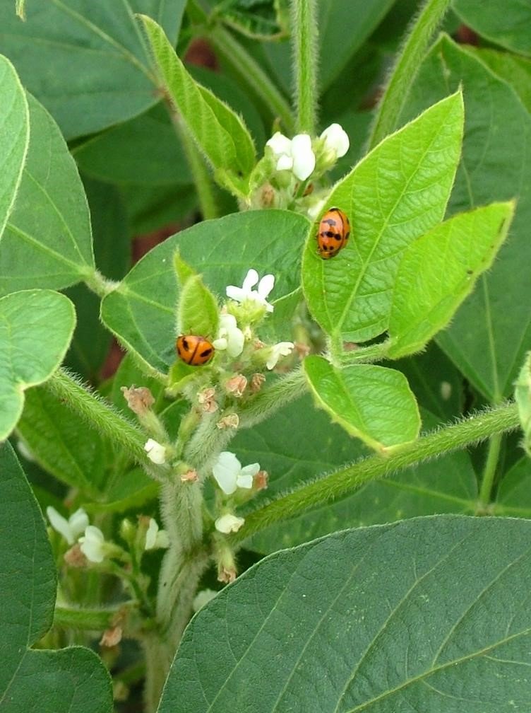 - Markedly delayed maturity in unsprayed headland contrasting with harvest ready maturity of the main crop which as sprayed with pirimicarb (under permit) to control a well-above threshold soybean aphid population