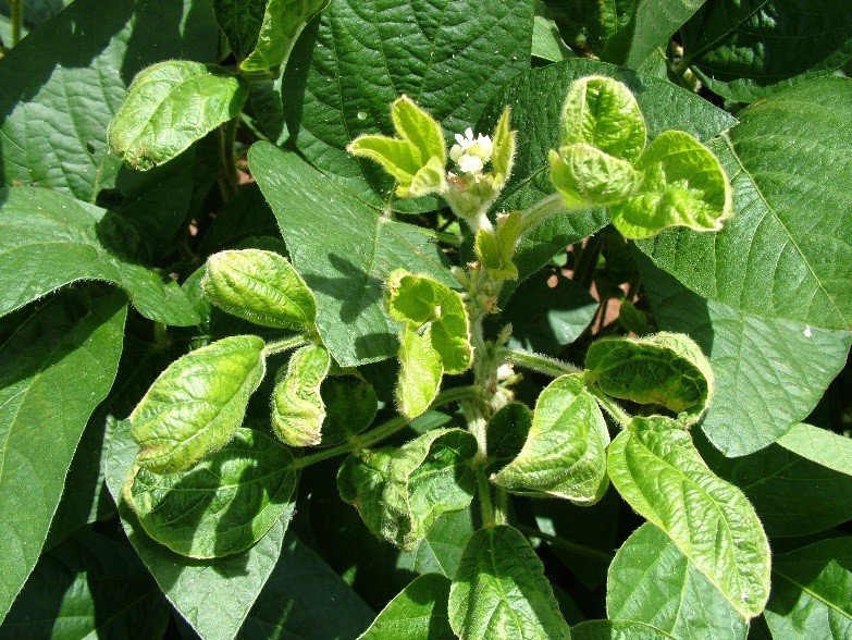 - Distorted and sticky aphid-infested leaves on a heavily infested soybean plant. Note the pale cast-off aphid skins on the older leaf at the top of the picture.