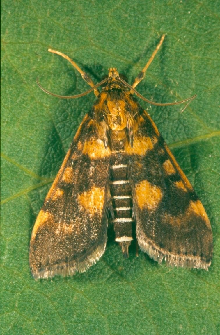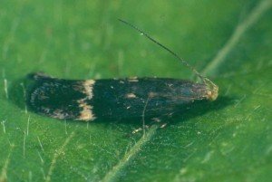 Soybean moths are small (6 mm long) with dark folded wings with a white band. The legume web-spinner moth is much larger (13 mm wingspan) and is brown with yellow markings. The soybean leafminer also has folded wings but is very small (2 mm long) with shining orange wings with white spots ringed with black.