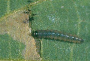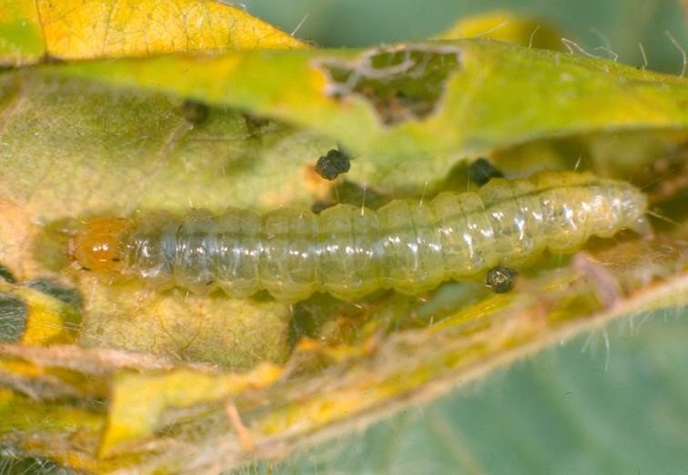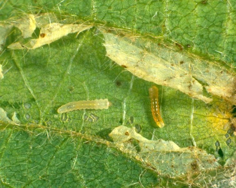 - Soybean moth larva (5 mm) and typical leaf-mining damage
