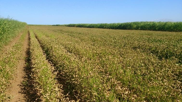 Soybean moth larvae are easily controlled with abamectin at 300 mL/ha under Permit 14288 (valid until 30 June 2017). Check that larvae are not in the pale pre-pupal stage (see image below) as they will have stopped feeding and will not be controlled by the insecticide. Feeding larvae die inside the leaves and turn an opaque grey colour.