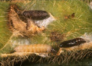 - Soybean leafminer larvae (2mm) inside cut-open leaf mine