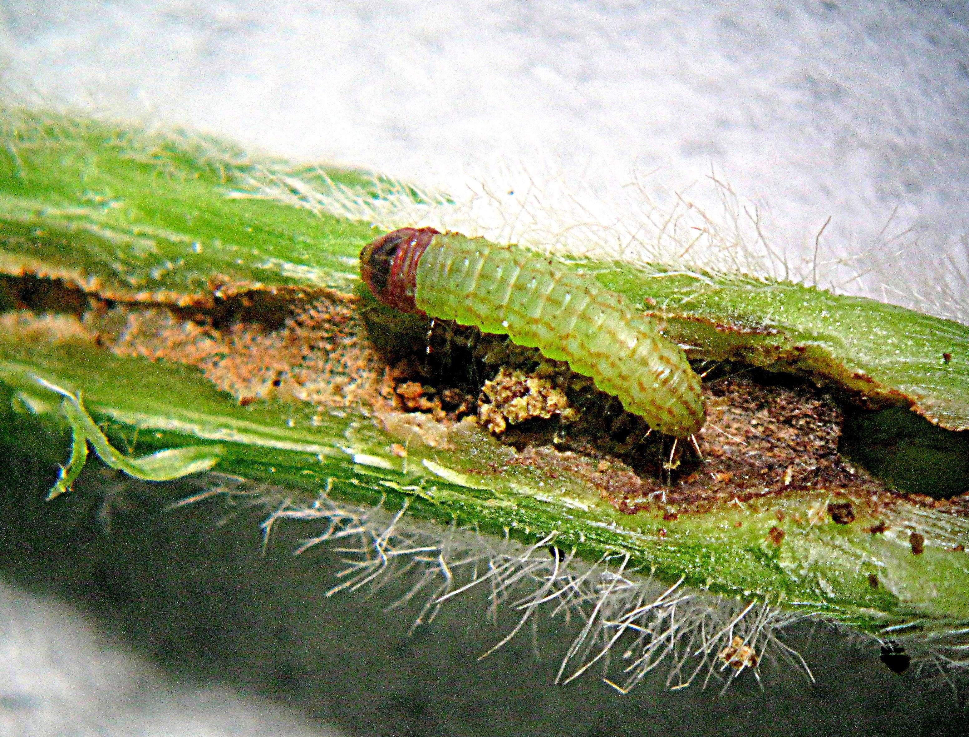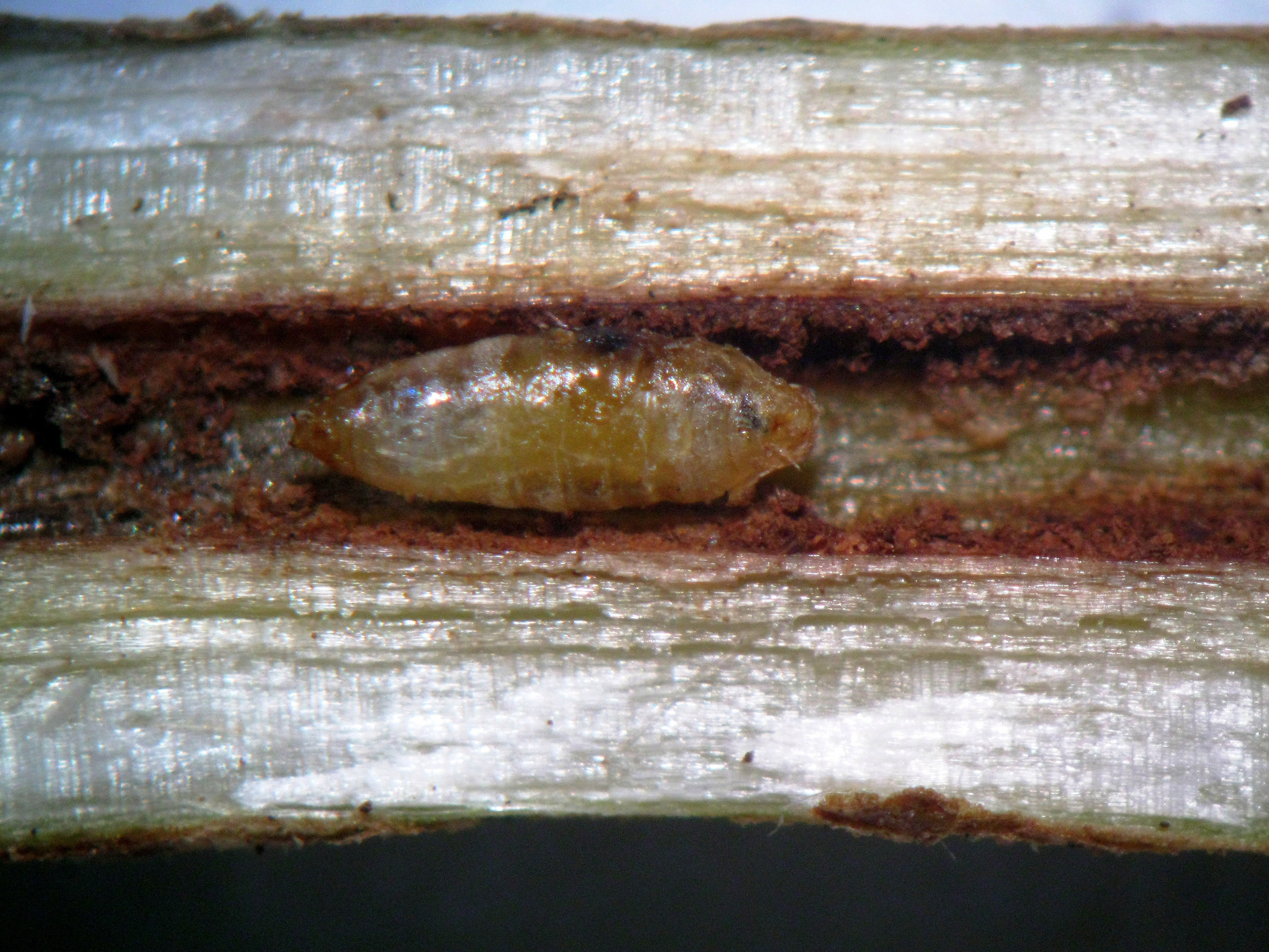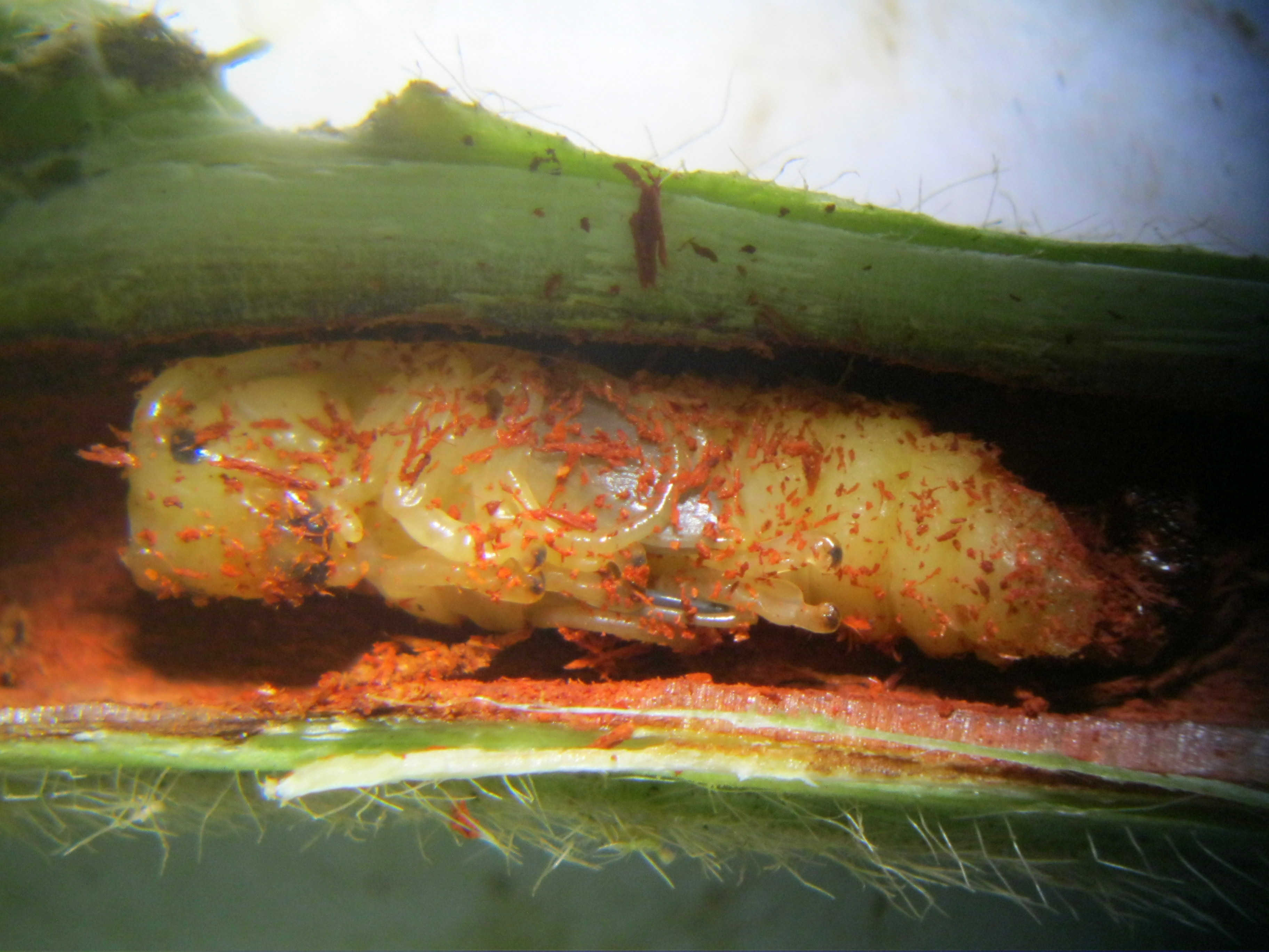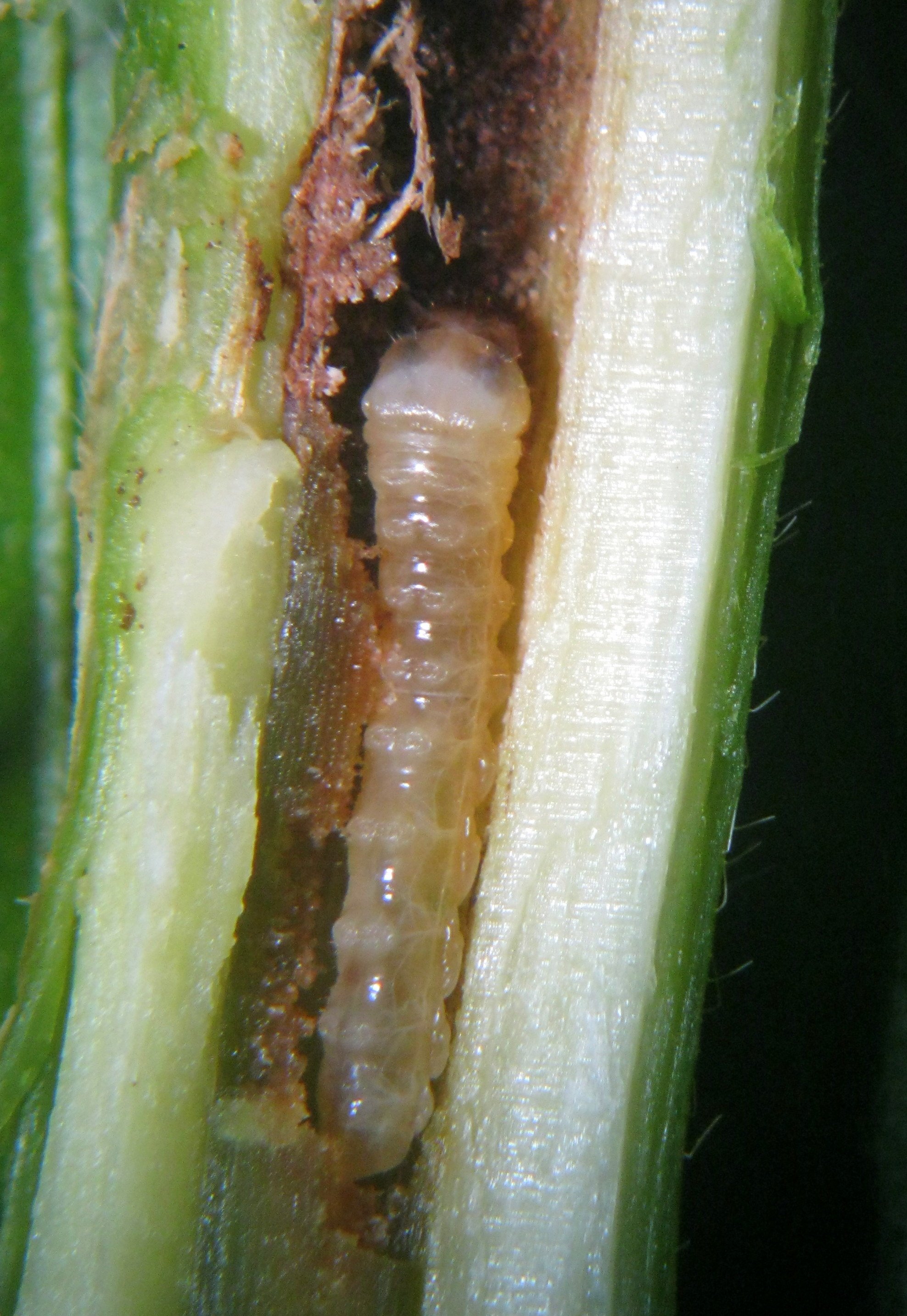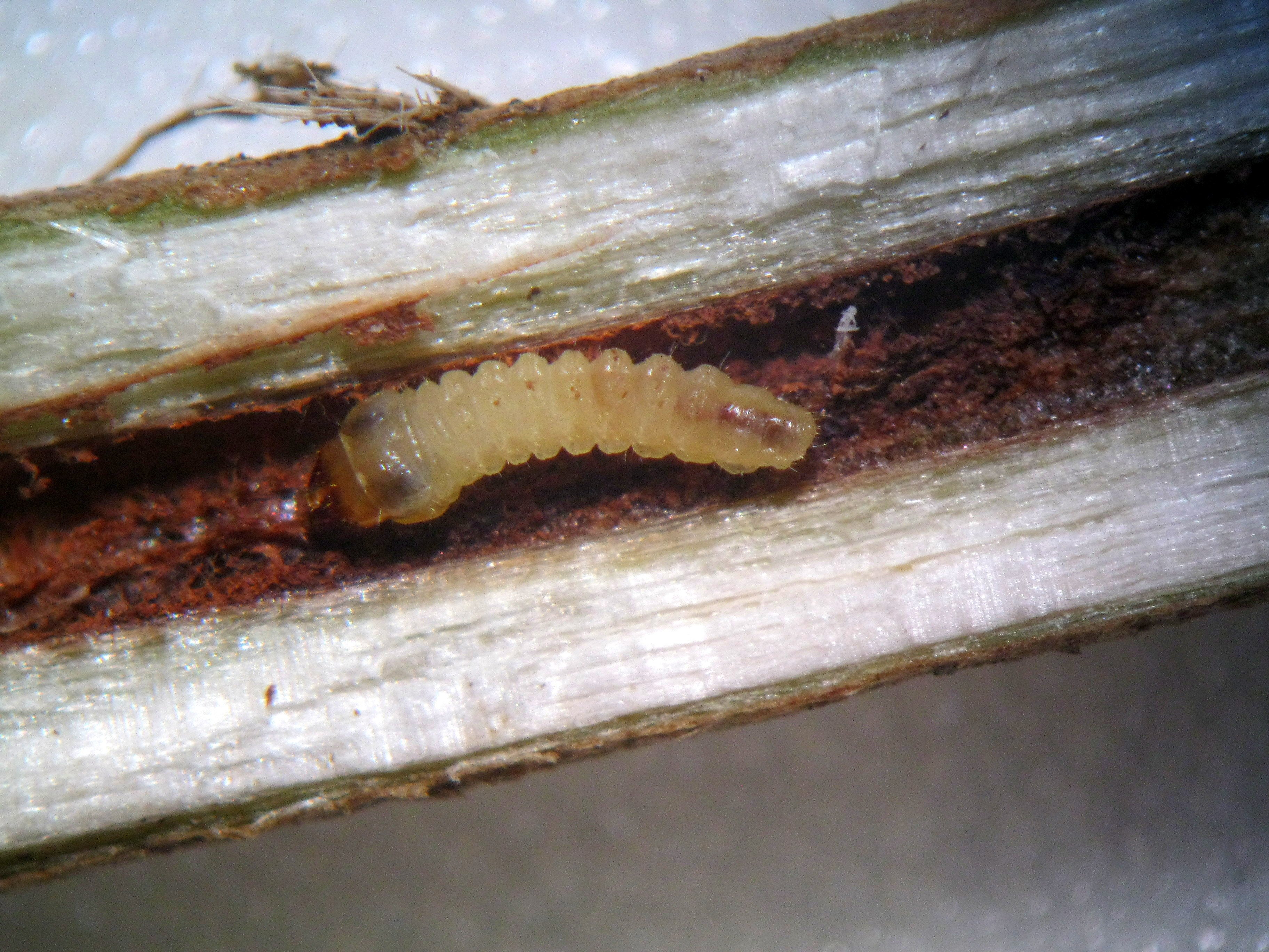 - Larva (4 mm) tunnelling in pith in the plant’s stem