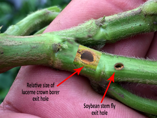 Note that two other pests (lucerne crown borer or Zygrita, and etiella) can also tunnel in soybean stems and cause similar damage, i.e. eaten out and brown, discoloured pith (see below). Any agronomic measures to reduce plant stress, particularly irrigation, will also help mitigate the impacts of stem fly, crown borer and charcoal rot.