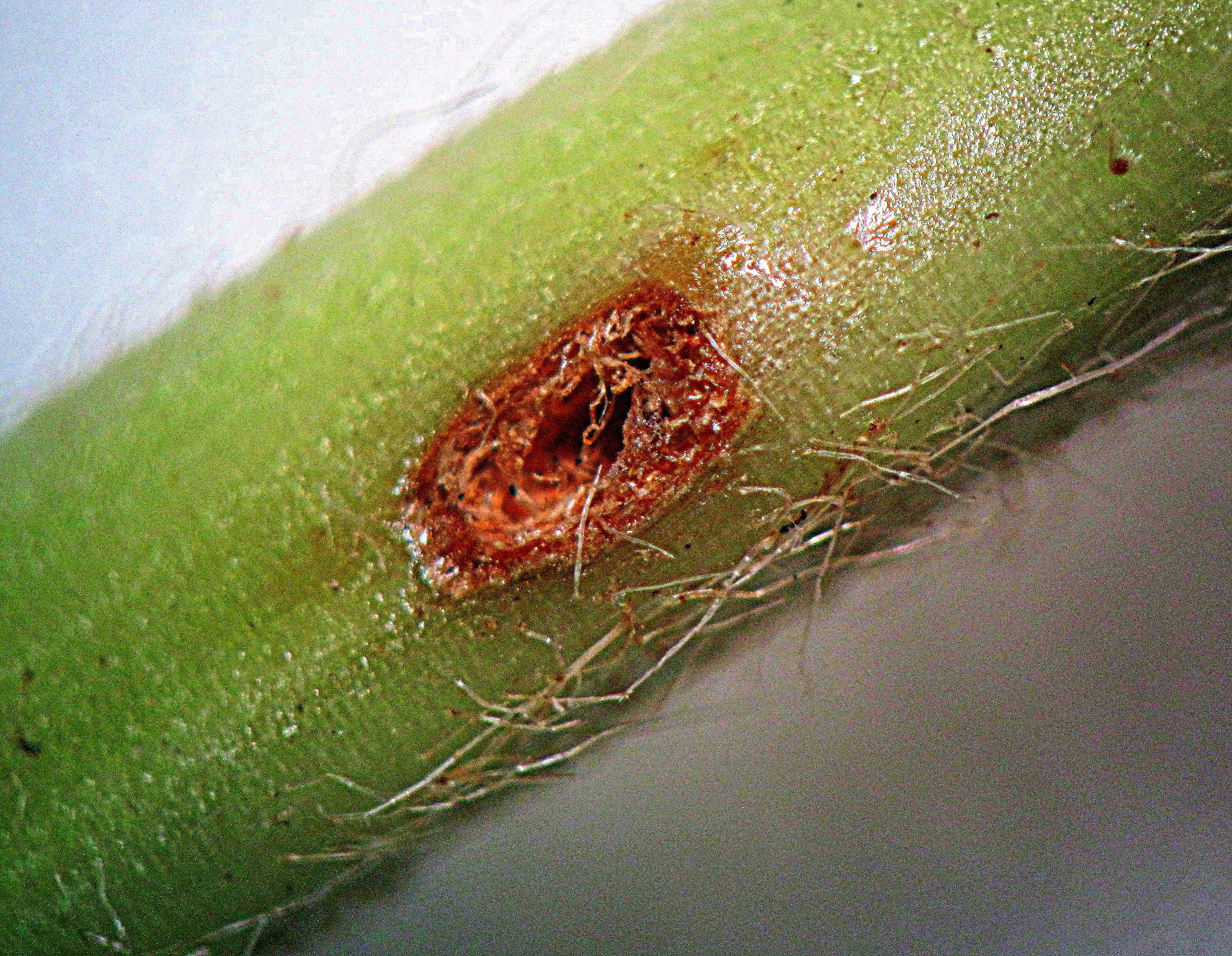 - Soybean stem fly exit hole (2 mm internal diameter) made by larva prior to pupation